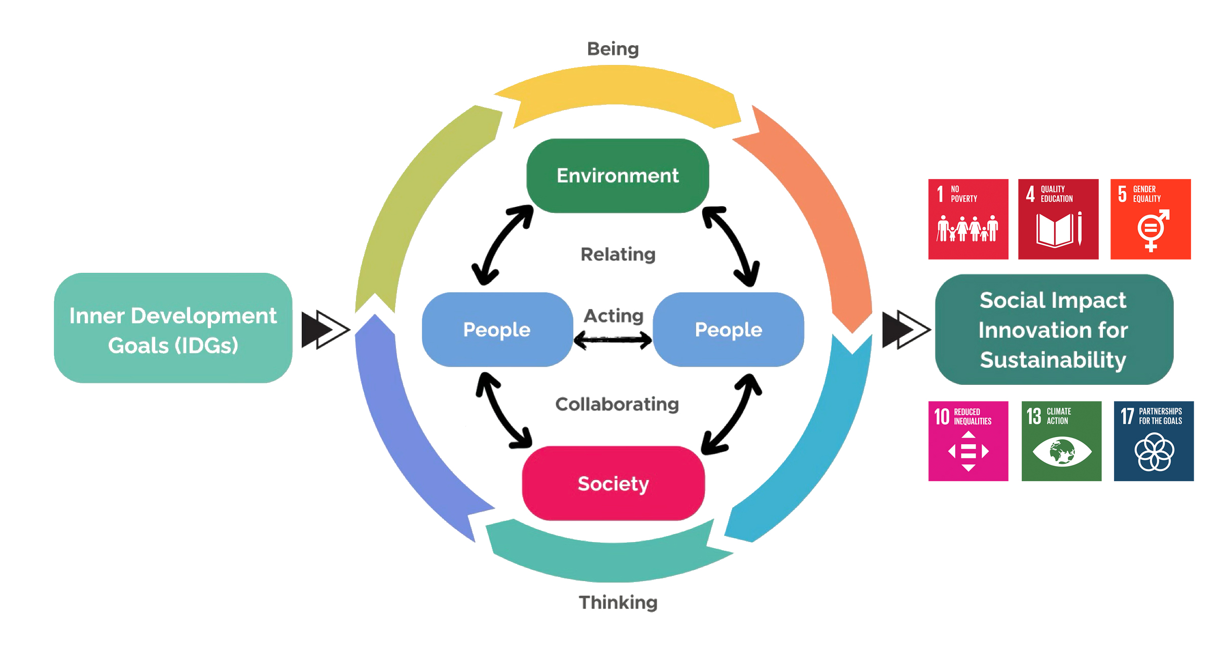 IDGs serve as the core foundations for people’s internal development by focusing on the relationship to self, which are essential for individuals to become agents of change. Through IDGs, the pathway labeled “being” refers to nurturing our inner selves and strengthening our connection to our thoughts, emotions, and body allows us to be present, intentional, and calm when confronted with complexity. Meanwhile, IDGs also present “thinking” which enhances our cognitive abilities by considering diverse perspectives, analyzing information, and understanding the world as an interconnected whole is crucial for making wise decisions.